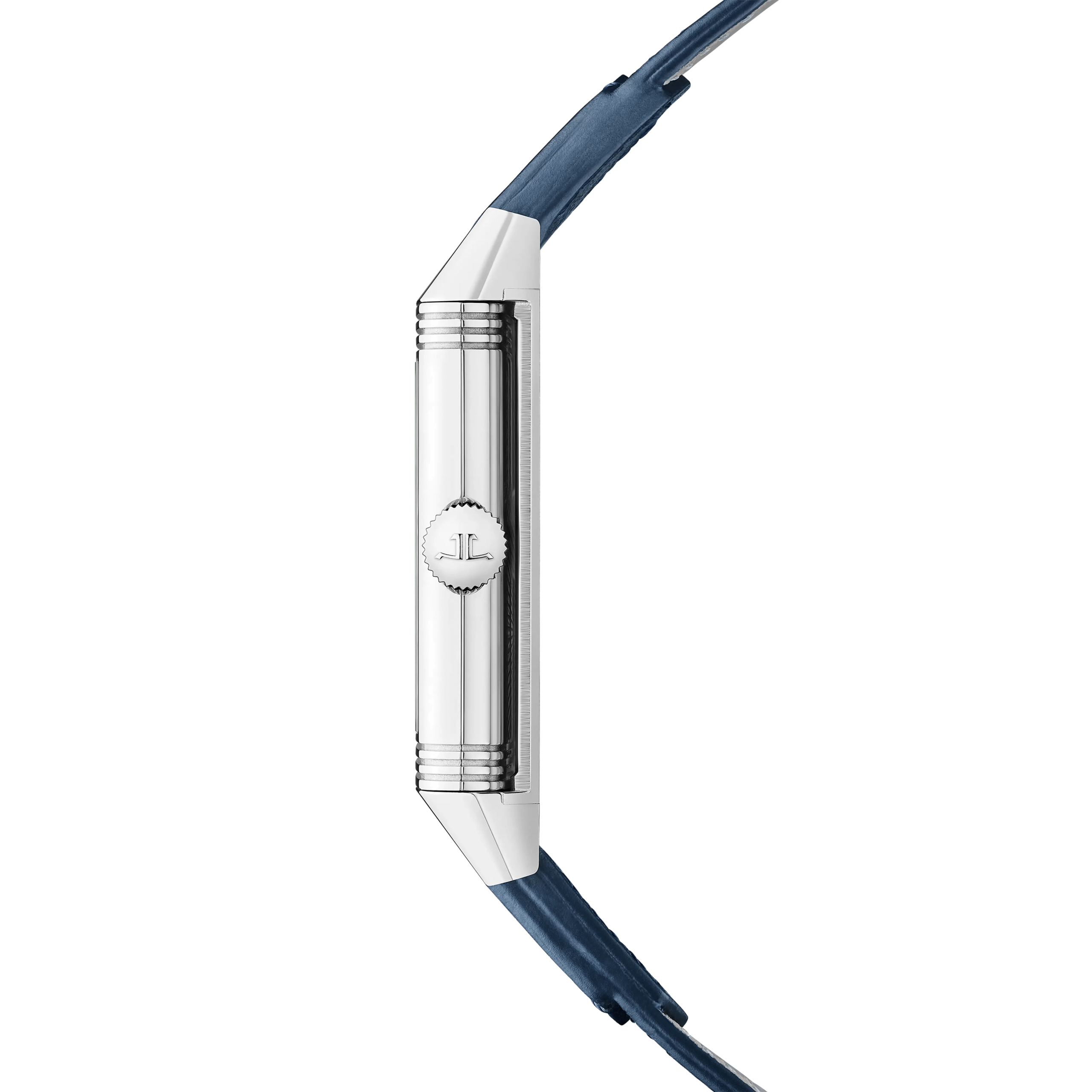 Chemin de fer, trapezoidal index, Dauphine hands, emblematic gadroons… following the signature codes of the first 1931 models, the Reverso Tribute Monoface is ideally proportioned. Measuring 40.1 x 24.4 mm, the case fits perfectly the shape of the wrist, making it an everyday watch. Underneath the sunray brushed blue lacquer dial, the reverse can be customized with an engraving or lacquer motif. Based on a Fagliano design specific to the Reverso, the blue calfskin strap has a double finish: smooth flaps, Saffiano grained for the rest. To keep the heart of the watch beating, the in-house Calibre 822 offers 42 hours of power reserve.