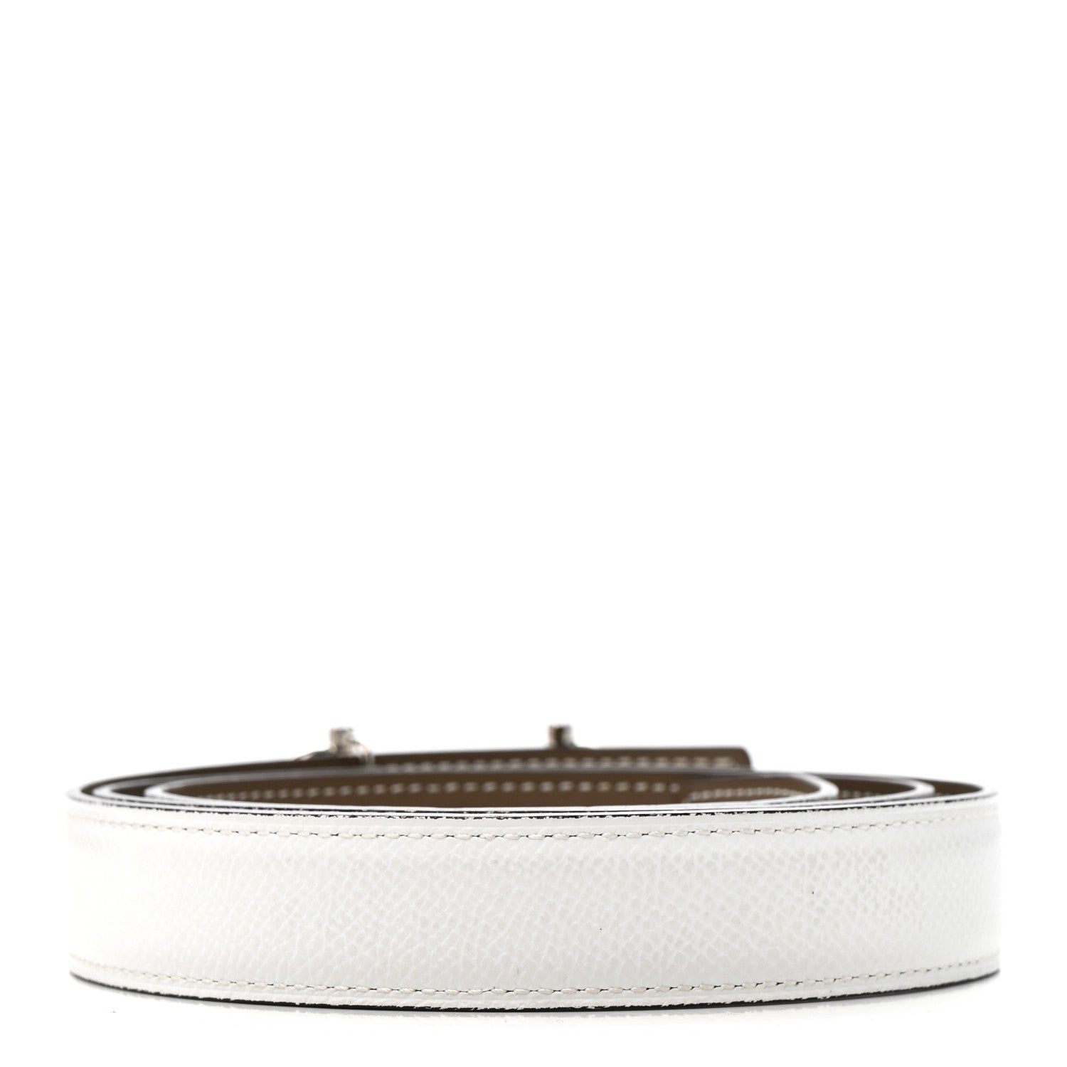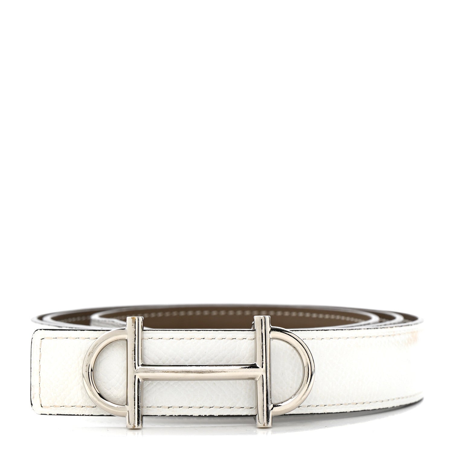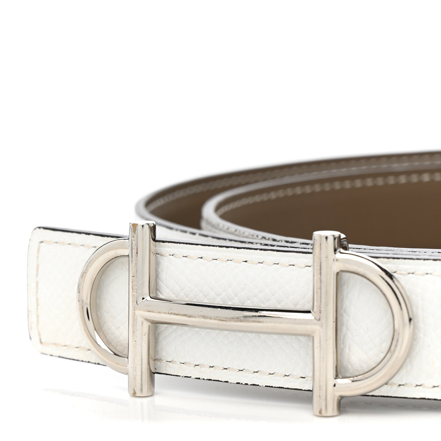 This is an authentic Swift Epsom 24mm Gamma Belt size 90 or 36 in White and Etoupe. This stylish belt is crafted in reversible swift calfskin leather in grey and white epsom leather on the other side. It also features a thin palladium Hermes H buckle.