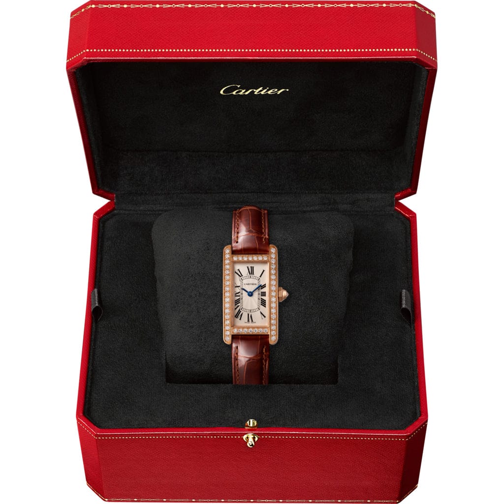 Tank Américaine watch, small model, quartz movement. Rose gold 750/1000 case and octagonal crown set with 49 brilliant-cut diamonds totaling 0.98 carat, silver flinqué dial, blued-steel sword-shaped hands, brown alligator leather strap, rose gold 750/1000 ardillon buckle. Case dimensions: 34.80 mm x 19.00 mm, thickness: 7.34 mm. Water-resistant up to 3 bar (approx. 30 meters/100 feet).