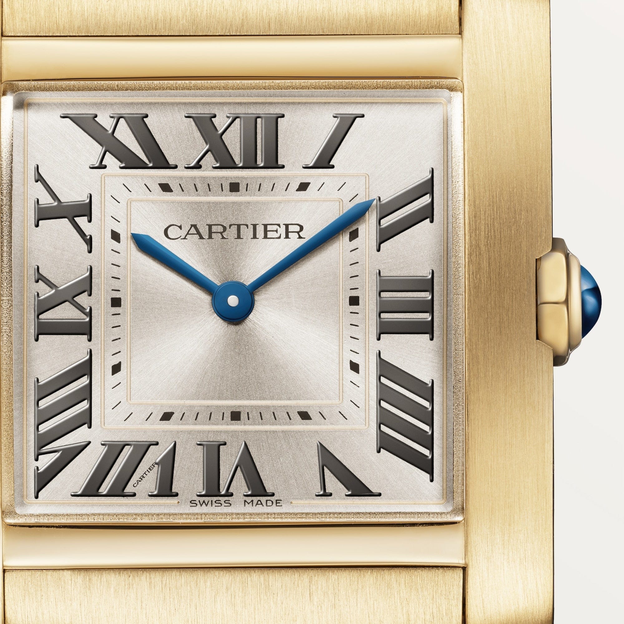 Tank Française watch, medium model, quartz movement. Case in 18K yellow gold (750/1000). Faceted crown in 18K yellow gold 750/1000 decorated with a sapphire cabochon. Golden sunray dial, blued-steel sword-shaped hands, sapphire crystal. Bracelet in 18K yellow gold (750/1000). Dimensions: 32 mm x 27 mm, thickness: 7.1 mm. water-resistant to 3 bar (approx. 30 meters/100 feet).