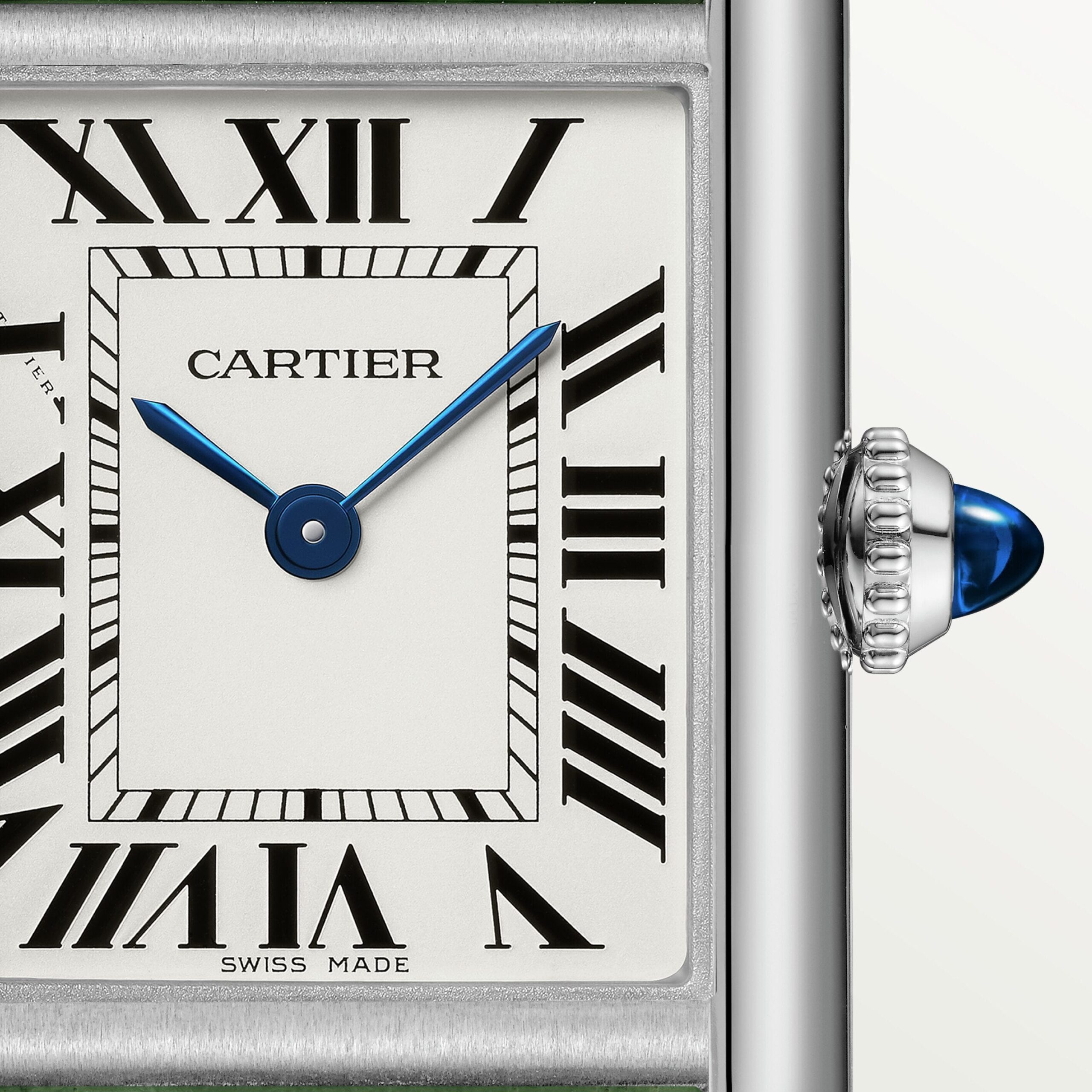 Tank Must watch, small model, photovoltaic SolarBeat™ movement. Steel case, beaded crown set with a synthetic cabochon-shaped spinel, silvered dial, blued-steel sword-shaped hands, light green strap (made with non-animal leather), steel ardillon buckle. Case dimensions: 29.5 mm x 22 mm, thickness: 6.6 mm. Water-resistant to 3 bar (approx. 30 meters).