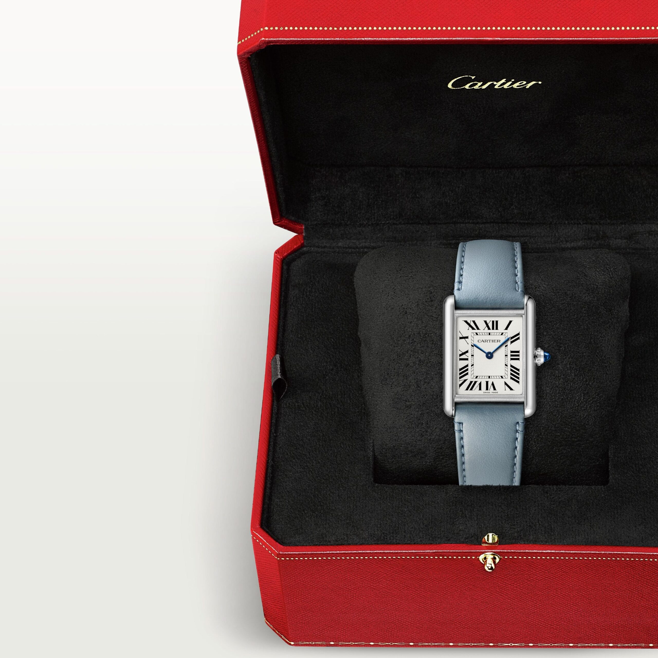 Tank Must watch, large model, photovoltaic SolarBeat™ movement. Steel case, beaded crown set with a synthetic cabochon-shaped spinel, silvered dial, blued-steel sword-shaped hands, blue strap (made with non-animal leather), steel ardillon buckle. Case dimensions: 33.7 mm x 25.5 mm, thickness: 6.6 mm. Water-resistant to 3 bar (approx. 30 meters).